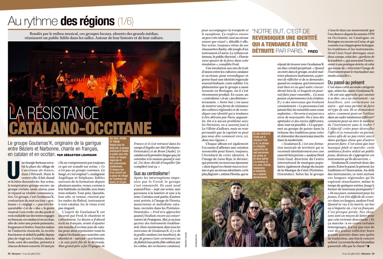 C’est ainsi que Goulamas’K s’est vu honorer d’un article dans l’hebdomadaire Marianne N°1322 du 13/07/2022 dans la rubrique Au rythme des régions et au titre détonnant La Résistance Catalano-Occitane.